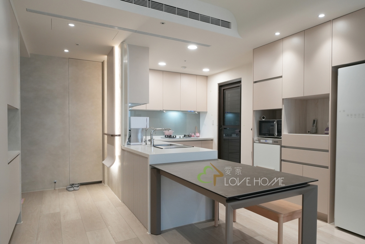以奶茶色營造溫雅氛圍,並透過中島設計提升場域機能