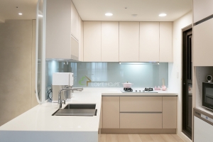 整體空間以柔和奶茶色系為主軸,搭配淺木地坪與俐落線條,呈現乾淨純粹的設計語彙。 廚房規劃以中島結合餐桌,提升場域機能的靈活性,同時串聯料理與用餐動線。 櫃體以隱藏式收納手法消弭凌亂感,讓視覺保持純淨一致。 在光影的映照下,展現溫潤卻不失質感的現代居家氛圍。