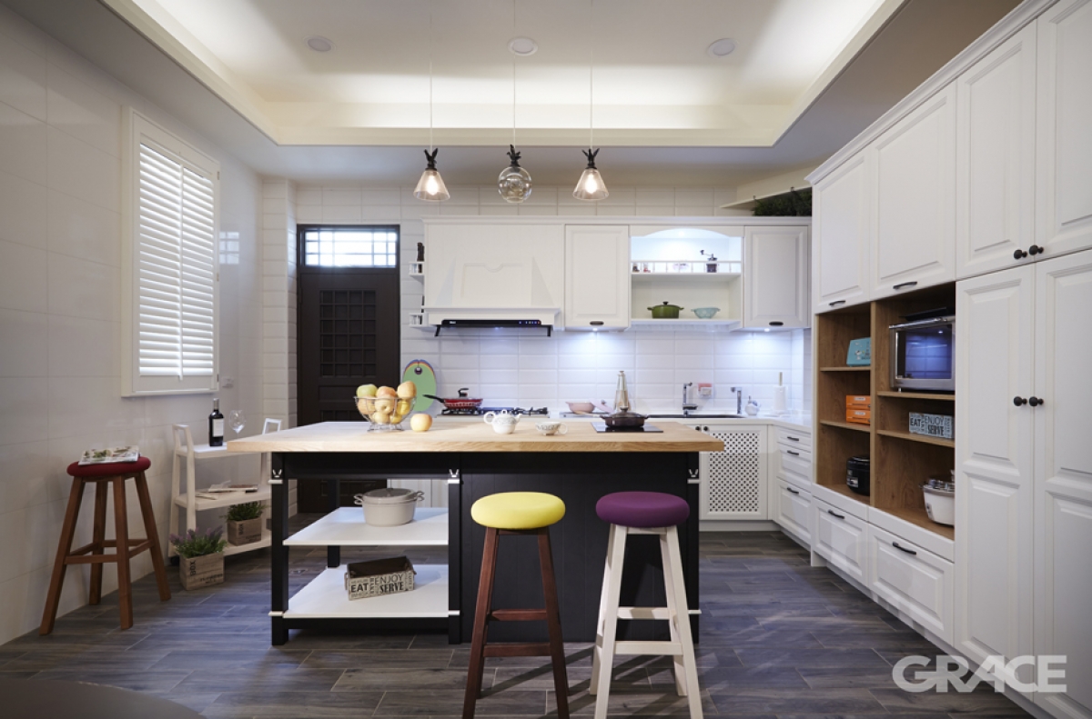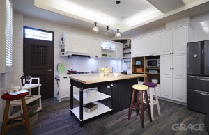 廚房打造夢想中黑白美式鄉村風廚房,簡化了一些鄉村風的粗糙原始感與花紋圖騰,多了一些現代風的簡約時尚感,適合喜歡文明也熱愛自然的都市人,所以又稱作「都會鄉村風」。