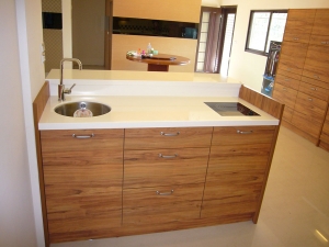 我的廚房會轉彎,運用木紋做橫向設計,把空間做到無限延伸的美學感